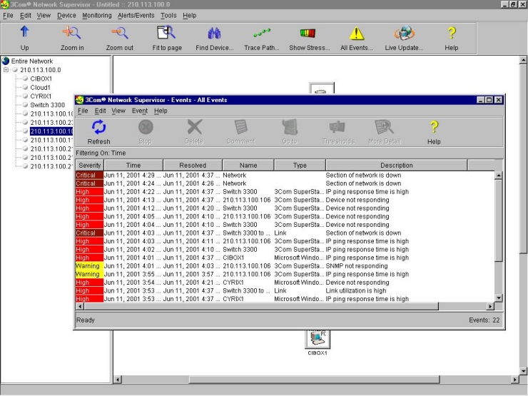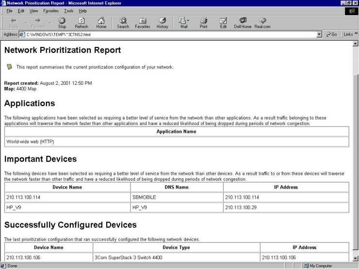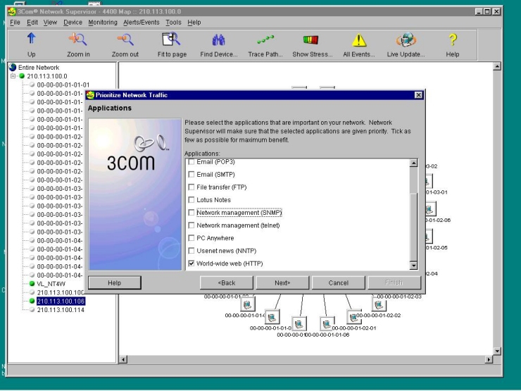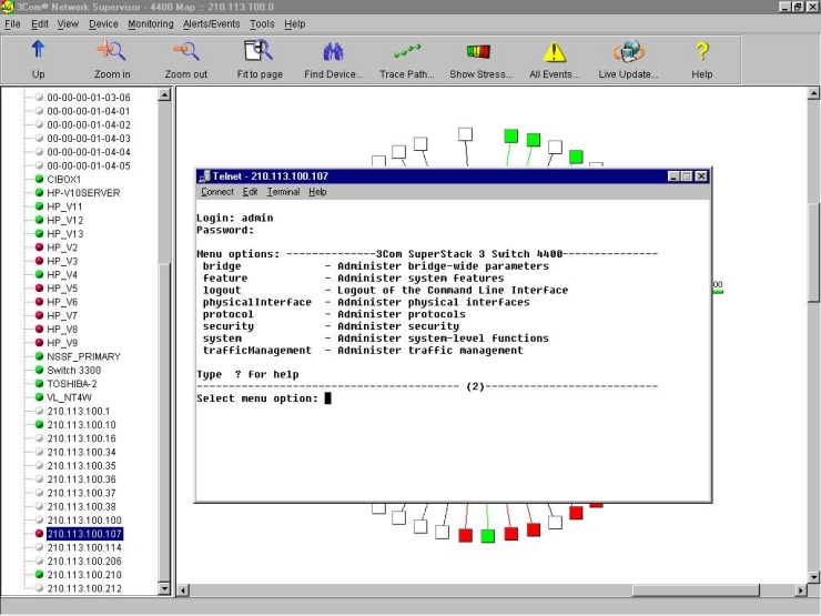 While several of these menu options are replicated in the web-based manager, there are still many � such as setting up VLANs � that must be done at the console level. This is not uncommon among switch vendors but does render the Web-based management somewhat redundant unless you really prefer to work with a browser. One reason why you might want to use the web-based manager is that it enables at least an element of point �n� click, mouse-based configuration. The switch is presented in graphical format onscreen with a menu on the left-hand side of the browser. So, for example, to configure the basic setup of a port you simply click on the graphic of it, choose the option you want from the drop-down menu that appears and type in the required information. Using the �Explorer� type menu on the left involves clicking on an option to expand it and reveal more sub-menu options which are then accessed by another click. Typically you are then presented with a text box or check list, depending on the nature of the operation. However, the overall appearance of the browser-based manager does leave a little to be desired even if it is as good as that provided by most of the opposition. The main problem is that it does not allow you to configure the full range of 4400 options, notably the QoS parameters, though Network Supervisor (see below) does this job instead. Managing with Network Supervisor The third management option provided with the 4400 is 3Com�s Network Supervisor 3.0, Windows-based software, effectively the next generation of Transcend for those familiar with previous 3Com offerings. Unlike the console and browser options which are geared specifically to configuring the 4400, Network Supervisor is a generic SNMP manager, with some added functionality specifically for controlling 3Com products, such as the 4400. The first thing you have to do with Network Supervisor is to let it auto-discover the network � identifying all devices on the network and how they are inter-connected. Once the map is created you can monitor devices and links as well as accessing the 3Com switches directly via the Telnet or web-browser options we�ve already described. Network Supervisor can also be used to download software updates for the switches and upload them directly onto the devices. Discovering the network is achieved via a wizard-based routine that prompts you for some basic discovery information such as local subnet only or all subnets reachable, which SNMP community strings to search for and whether IP telephony nodes should be included. There is also an option to lightly stress monitor the network from the moment the map is created. In most cases, simply clicking through the screens and accepting the default options would suffice. The discovery process then creates a network map, that is a visual representation of your network. This is a quick process (a few minutes maximum) for a relatively small network but could take some amount of time on a larger network, though it is limited to 1500 network nodes (plus 1500 IP telephony nodes). To keep your map up to date, you can manually add and remove network objects, or rediscover it to update the map automatically with any changes that have occurred from an option within Tools on the menu bar that sits at the top of the screen. Within a map you can also group devices, so create a realistic facsimile of a departmental layout, say, in a real office. An online Help system is always available and contains a glossary of networking terms, useful for less experienced users. Once the network is discovered, the screen splits with network node addresses (these may be the device name, DNS name, IP address or MAC address, for example, depending on what Network Supervisor was able to discover about that particular device) on the left and the network map on the right. Right-clicking on a device name/address reveals a drop-down menu where the number of options vary depending on the device. For example, if it is a 3Com switch such as the 4400, there are options to Telnet in the device or web manage it, as well as a number of standard options such as showing the monitored state of the device, an option to set alerts and viewing any �events�, such as thresholds being exceeded.